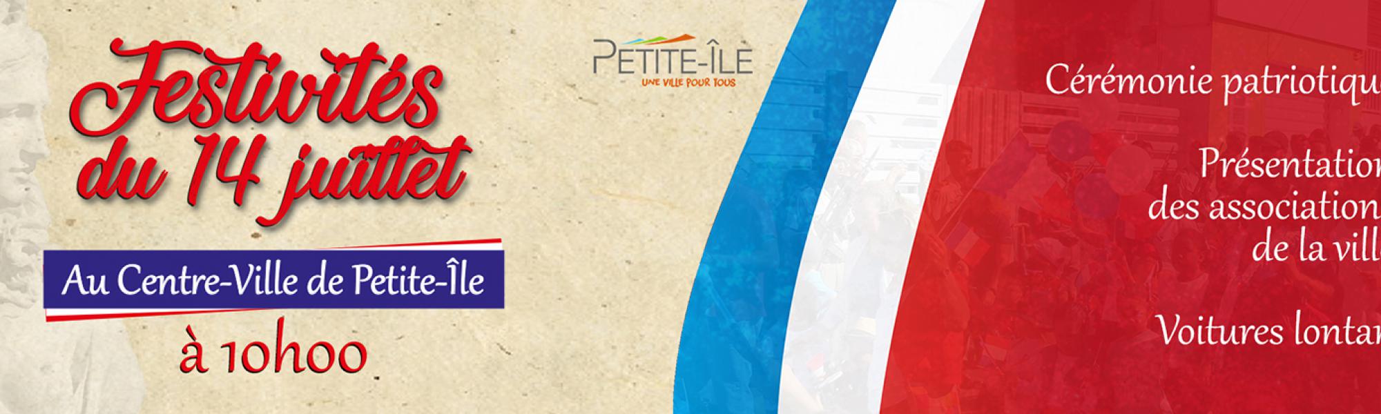 Festivités du 14 juillet Au Centre-Ville de Petite-Île #14 juillet #événement #cérémonie #voitures lontan #festivités Date de l'actualité Le Lundi 6 juillet 2020 Introduction à 10h Cérémonie patriotique Présentation des associations de la ville Voitures lontan attach_file 4x3 14 juillet 2020 attach_file 228-réglementation temporaire circulation et stationnement 14 juillet attach_file 229-fermeture du parking du Vieux Moulin 14 juillet attach_file 230-fermeture parking les Salangagnes 14 juillet attach_file 231-fermeture parkings Joseph Suacot 14 juillet 4x3 14 juillet 2020 4x3 14 juillet 2020